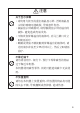 安全注意事项 衷⼼感谢您购买本机器。 使⽤本机器之前,请仔细阅读“ 安全注意事项”之后, 正确使⽤。 危险 表⽰若⽆视此标识进⾏误操作,可能 导致⼈员死亡或重伤危险的临近。 警告 表⽰若⽆视此标识进⾏误操作,可能 导致⼈员死亡或⾝负重伤。 注意 表⽰若⽆视此标识进⾏误操作,可能 导致⼈员受伤及物品损伤。 图⽰举例 符 号 表 ⽰ “ 禁 ⽌ 事 项 ”。 ( 左 例 表 ⽰ 禁 ⽌ 拆 解 )。 ●符 号 表 ⽰ “ 必 须 事 项 ”。 危险 关于电池 电池中漏出的液体不慎⼊眼时,请⽴即采取以下 措施。 1. 不要揉眼,⽴即⽤清⽔冲洗。 2.