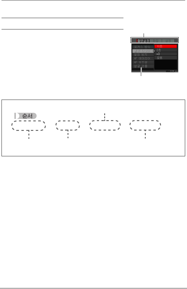 니다. 아래의 조작은 80페이지의 "메뉴 화면 조작의 예"에서 설명된 것과 동일합니다.