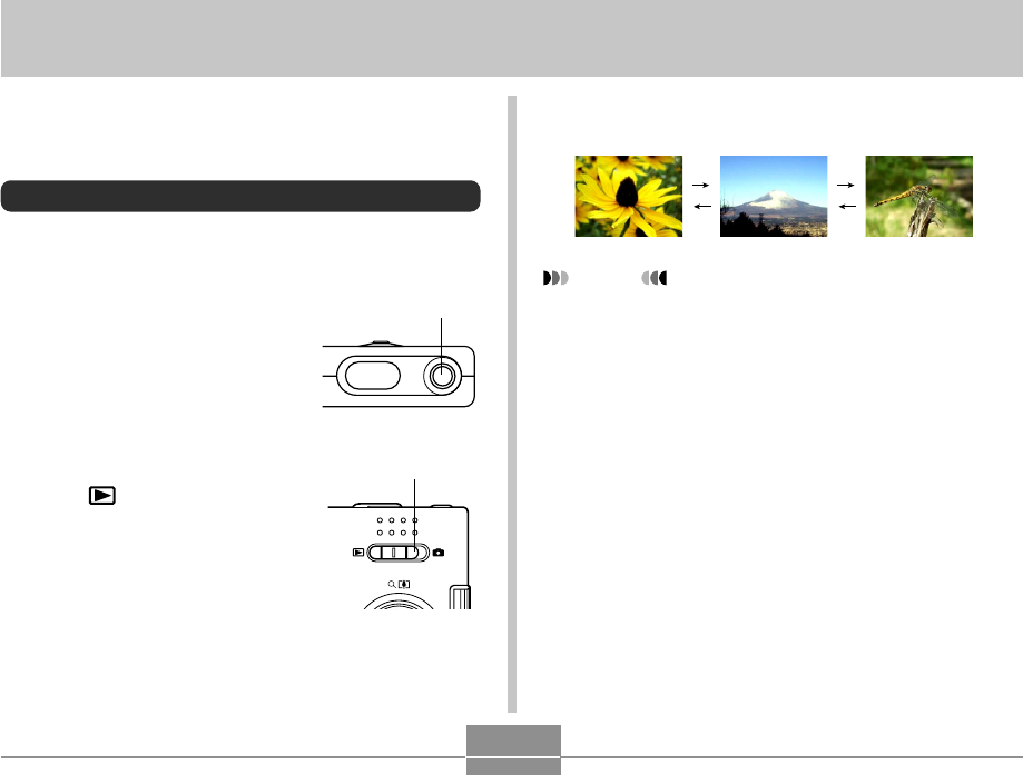 PLAYBACK PLAYBACK 3. Use [왘] (forward) or [왗] (back) to scroll You can use the camera’s built-in monitor screen to view images after you record them. through files on the monitor screen. Basic Playback Operation Use the following procedure to scroll through files stored in the camera’s memory. NOTES 1. Press the power button Power button • Holding down [왗] or [왘] scrolls images at high speed.
