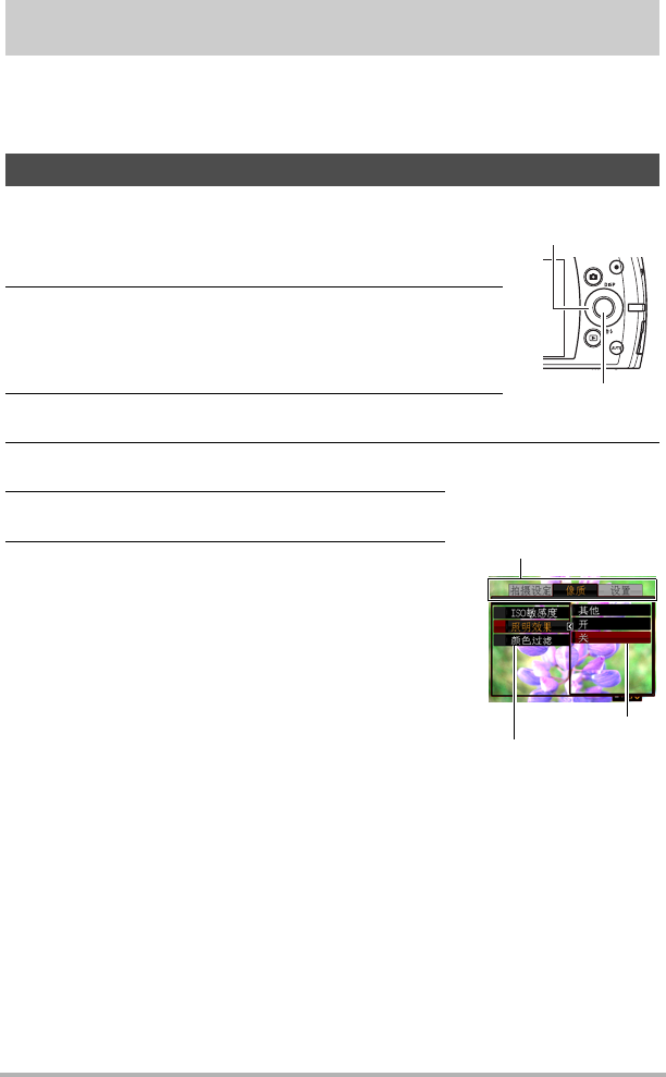 • 拍摄方式的选单内容和操作方式与显示方式不同。本节说明使用拍摄选单画面可以