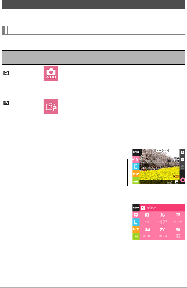 지). 여기에서는 자동 촬영 모드를 사용한 일반적인 촬영 방법을 설명합니다.