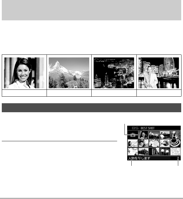 合った最適なカメラの設定が記録されています。望みのシーン(ベストショット)を選ぶだ