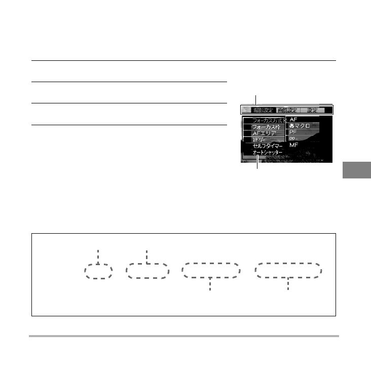本書ではメニュー操作の手順を下記のように記載します。前記の「メニュー画面の操作例」