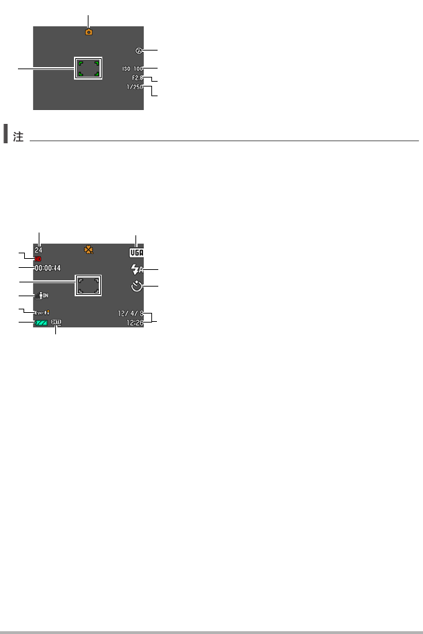 • 如果自动曝光错误,则在半按快门钮时,光圈值、快门速度、ISO 敏感度值会变为橙