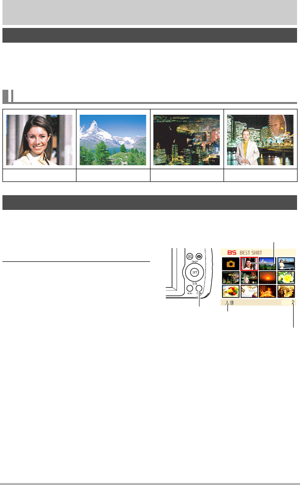 BEST SHOT提供一系列示范“场景”,可展示各种不同类型的拍摄条件。需要更改相