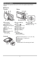 Delar och reglage Sidnumren inom parentes hänvisar till de sidor där respektive detalj förklaras närmare. . Kameran Framsida Tillbaka 8 9 bk 1 2 3 4 bl [ ] 5 7 6 1 Zoomreglage (s. 23, 42, 69) 2 Avtryckare (s. 23) 3 [ON/OFF] (strömbrytare) (s. 21) 4 Blixt (s. 33) 5 Mikrofon (s. 46, 77) 6 Objektiv 7 Främre lampa (s. 59) 8 Bakre lampa (s. 21, 24, 33) br bq bp bo bn bm 9 Knappen [0] (film) (s. 45) bkKnappen [r] (inspelning) (s. 21, 23) blRemhål (s. 2) bmKnappen [SET] (s. 29) bnKnappen [BS] (s.