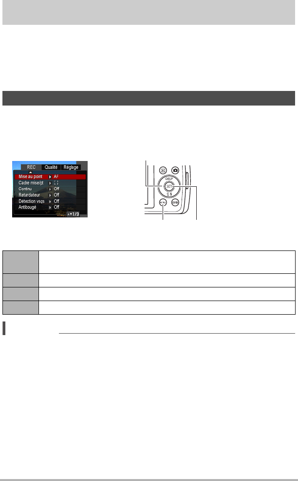 • Les paramètres du menu sont différents en mode REC et en mode PLAY.