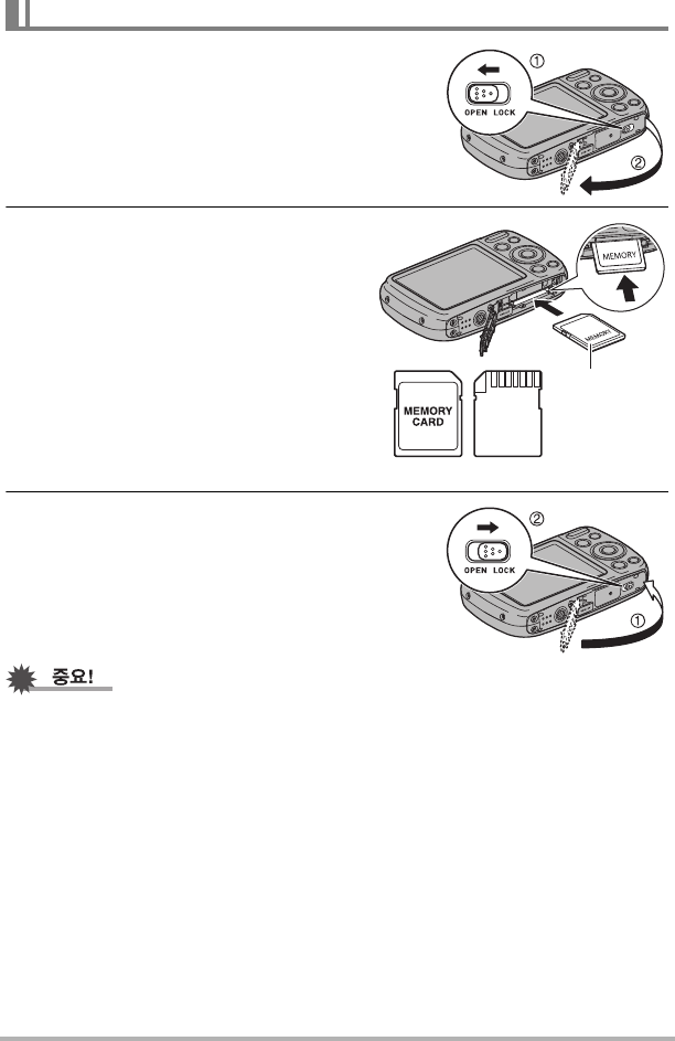 • 카드 슬롯에 물이나 그 밖의 이물질이 들어갔을 때에는 즉시 카메라 전원을 끄고 전지를
