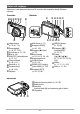 Delar och reglage Sidnumren inom parentes hänvisar till de sidor där respektive detalj förklaras närmare. Framsida Baksida 123 4 56 bk 7 bl bm bn 7 bo bp bq cm 9 cl ck bt bs br 8 Lägesväljare (s. 33, 41, 70) Zoomreglage (s. 34, 57, 123) Avtryckare (s. 31, 33) Blixt (s. 54) [ON/OFF] (strömbrytare) (s. 27, 31) Främre lampa (s. 45, 113) Remhål (s. 3) Funktionsring (s. 44, 122) Objektiv Mikrofoner (s. 71) Knappen [RING] (s. 44, 122) Knappen [0] (film) (s.
