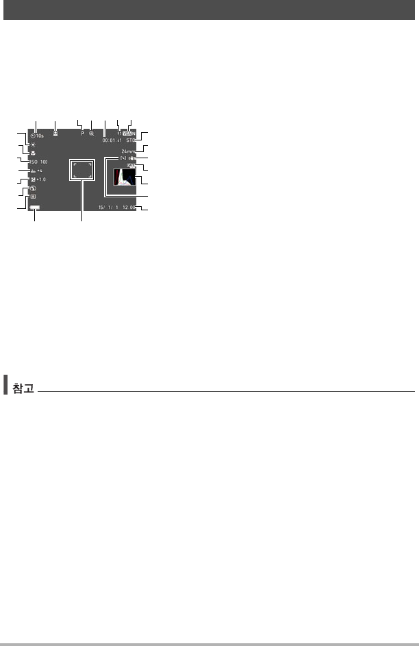 • 여기의 샘플 화면은 각종 모드에서 모니터 화면에 표시되는 모든 표시와 수치의 위치를