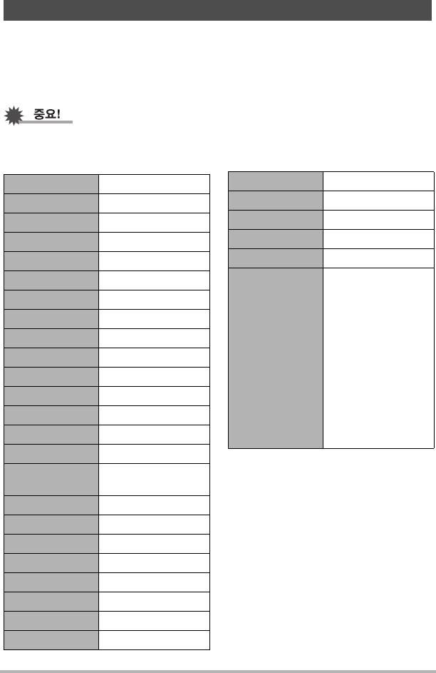 이 절의 표는 카메라를 리셋(165페이지)한 후에 메뉴 항목([MENU]를 눌렀을 때 표시되