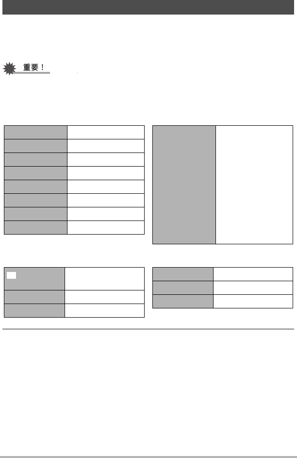 本節中的表格顯示您重設相機後,拍攝方式和顯示方式採用的初始預置設定 (第110