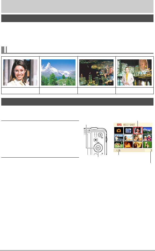 BEST SHOT可讓您使用各種示範 “場景”,適合各種不同種類的拍攝情況。當您必須