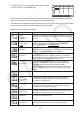 u Hyperboliska beräkningar (HYP) [OPTN]-[HYP] • {sinh}/{cosh}/{tanh} ... hyperbolicus {sinus}/{cosinus}/{tangens} • {sinh–1}/{cosh–1}/{tanh–1} ... invers hyperbolicus {sinus}/{cosinus}/{tangens} u Sannolikhets- och distributionsberäkningar (PROB) [OPTN]-[PROB] • {x!} ... {tryck efter att du har matat in ett värde för att erhålla värdets faktorial} • {nPr}/{nCr} ... {permutation}/{kombination} • {RAND} ... {slumptalsgenerator} • {Ran#}/{Int}/{Norm}/{Bin}/{List} ...