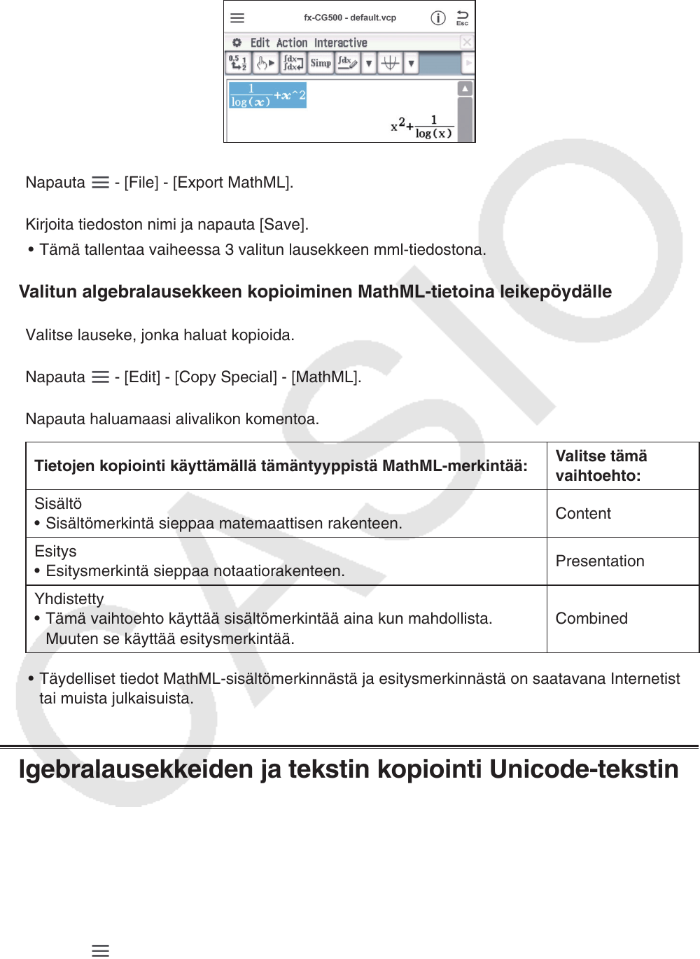 Noudata alla olevia ohjeita, kun haluat kopioida fx-CG500-sovelluksesta valittua tekstiä tai