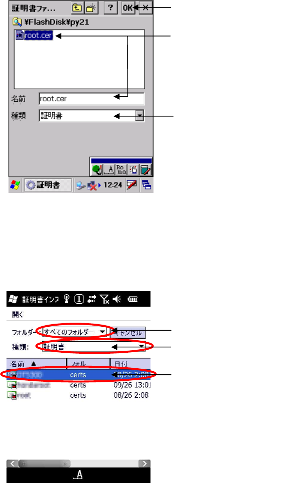 Windows Mobile OS は、種類を“証明書“にしてフォルダーを“すべてのフォルダー“、またはコピ