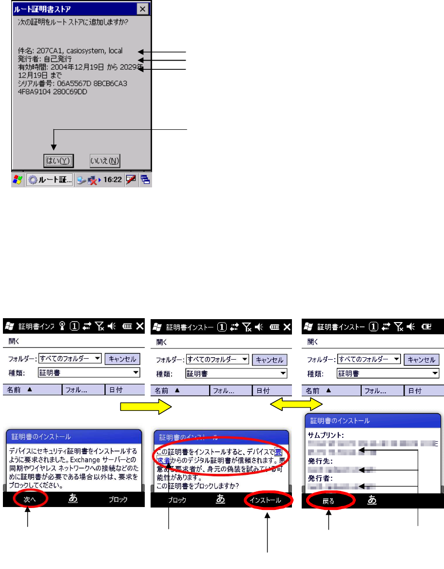 Windows Mobile OS は、ルート証明書のインストールの確認画面が表示されます。