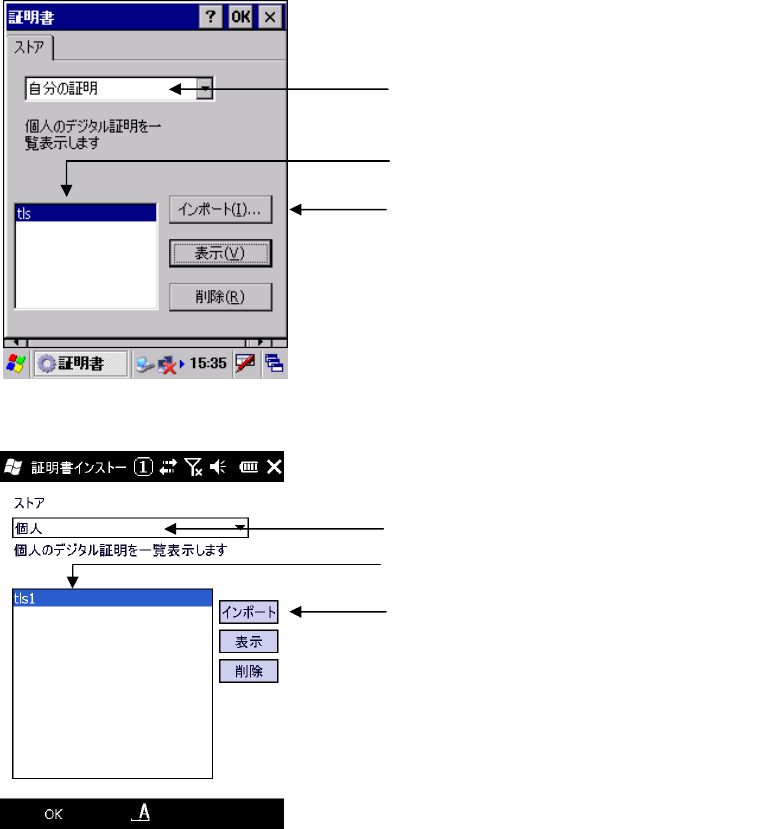 CE OS は“自分の証明書”を Windows Mobile OS は“個人”を選択して、ユーザ証明書を選択し“イン