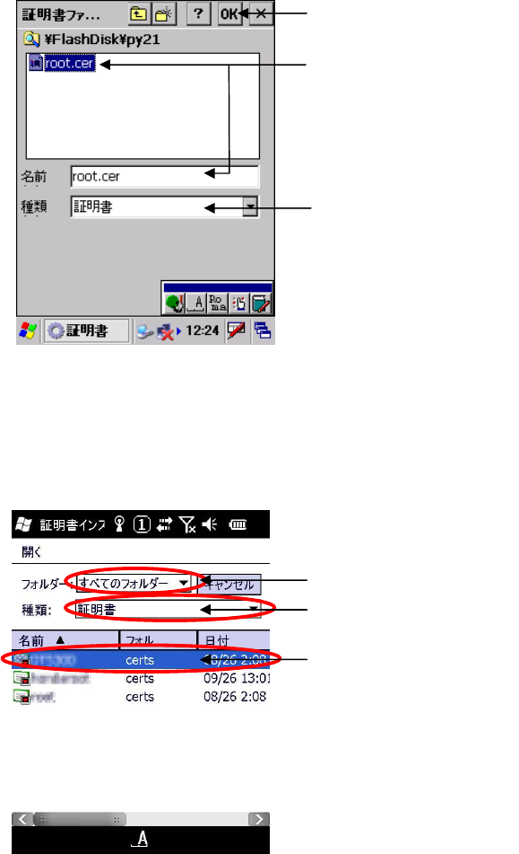 Windows Mobile OS は、種類を“証明書“にしてフォルダーを“すべてのフォルダー“、またはコピ