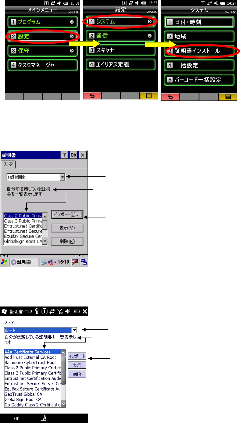 Windows Mobile OS のルート証明書のインポートは “ルート”を選択して、“インポート”をタップ
