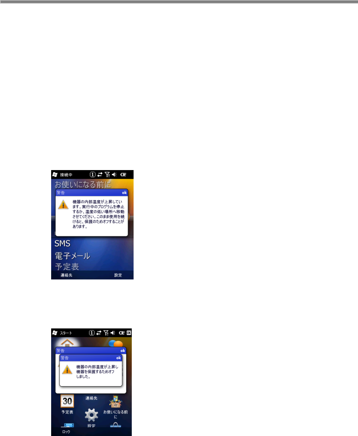 温度制限で電源を OFF した場合には、次回電源 ON 時に、以下の警告メッセージを表示します。