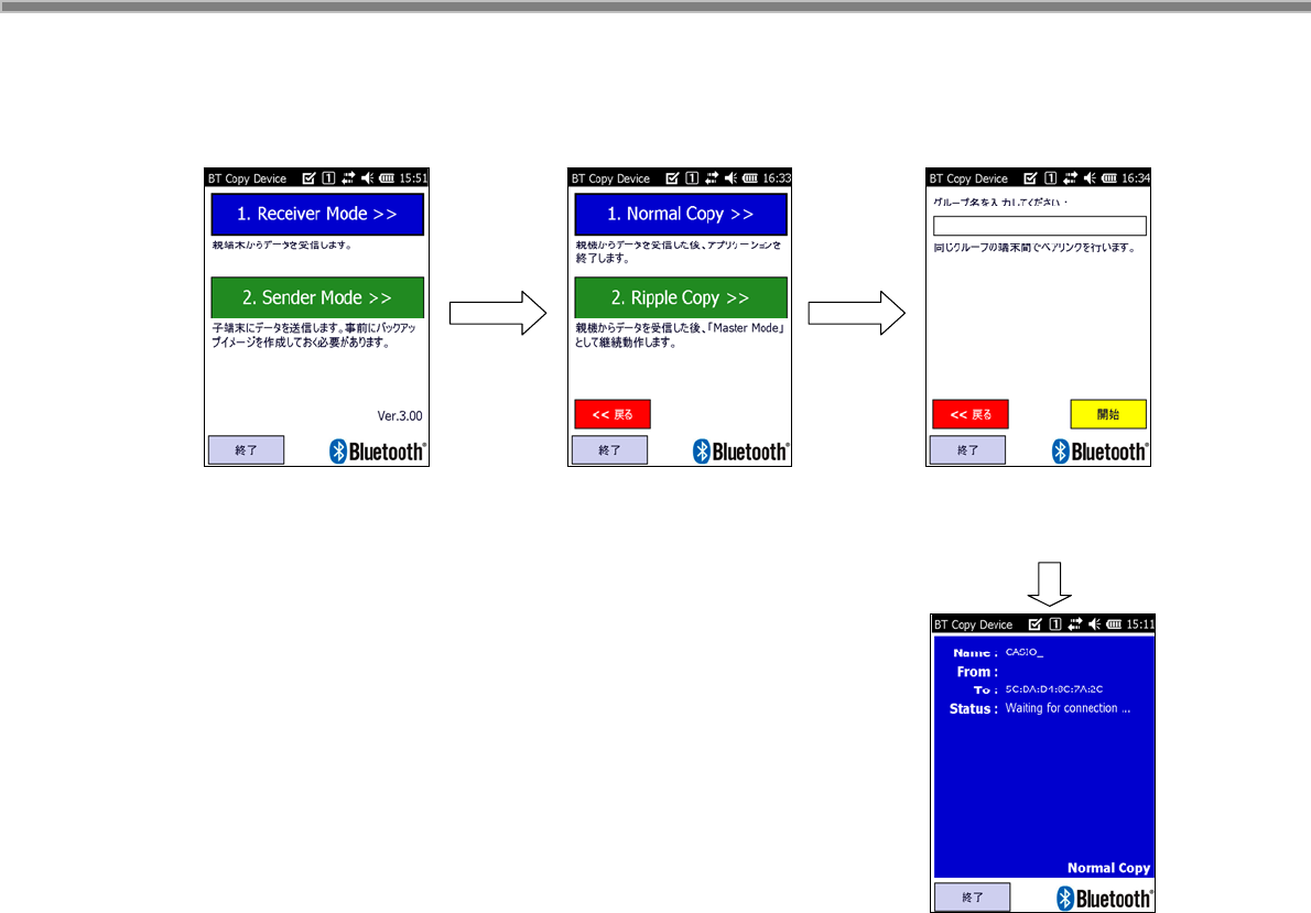 ・何らかの理由で通信エラーが発生した場合、親端末は子端末検索から、子端末は親端末接続待機から