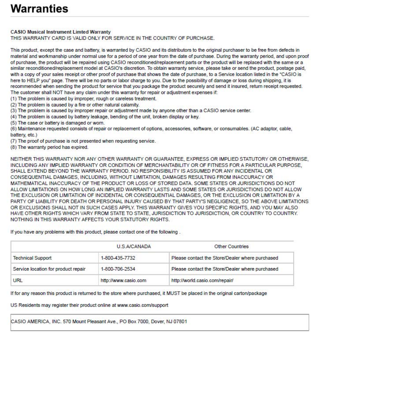Casio's Musical Instrument Limited Warranty