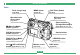 The following illustrations show the names of each component, button, and switch on the camera.