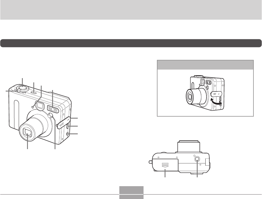 下示各圖介紹相機上各部件、鍵鈕及開關的名稱