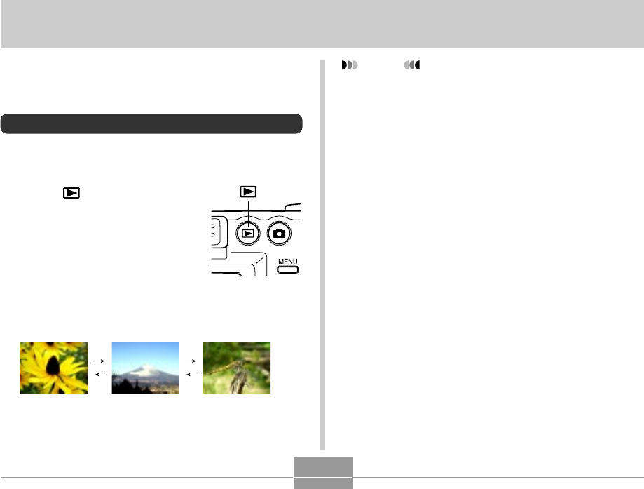 PLAYBACK PLAYBACK You can use the camera’s built-in monitor screen to view images after you record them. NOTES • Holding down [왗] or [왘] scrolls images at high speed. • In order to allow for faster playback image scrolling, the image that initially appears on the monitor screen is a preview image, which is of somewhat lower quality than the actual display image. The actual display image appears a short while after the preview image. This does not apply to images copied from another digital camera.