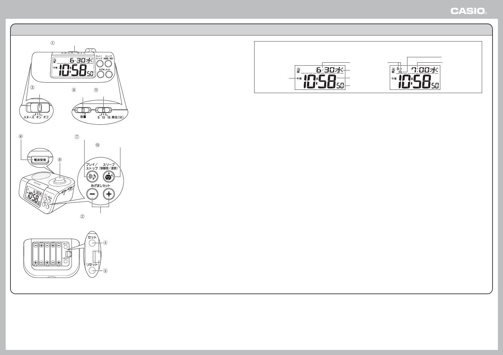 Operation Guide SQD-110J MA0407-A 各部の名称と表示の見方 1 スヌーズ/ライトボタン 押すと 4 ∼ 5 秒間ライトが点灯します。 ※ アラーム報音中に押すと音が止まります。 スヌーズ/ライトボタン (表面) ●表示の見方 <アラームがオフのとき> 2 めざましセットボタン アラーム時刻(または現在時刻など)を合わせるとき に使います。 アラーム スイッチ 音量 スイッチ 再生時間 スイッチ 3 アラームスイッチ アラームのスヌーズ/オン/オフの切り替えができ ます。 月・日 曜日 午後マーク (午前は消灯) <アラームがスヌーズのとき> スヌーズマーク アラーム アラーム時刻 マーク 時・分 秒 4 セットボタン 現在時刻などを合わせるときに使います。 5 リセットボタン 電池交換後、必ず押します。 ※ ボタンが押しにくい場合は先端の細いもので押して ください(製品を傷つけないようご注意ください)。 (側面) 電波受信ボタン プレイ/ストップボタン (裏面) スリープボタン (表面) ダイヤル スイッチ (全体図) 6 電波受信ボタン