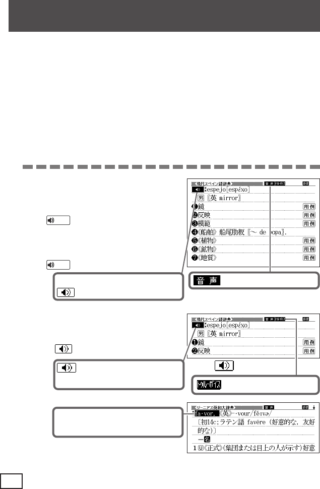 調べた単語などの発音を聞く(音声機能) 意味や解説の画面に表示されている、外国語の単語・熟語・例文を、音声 で発音させることができます。 次の2方式があります。 ●英語音声読み上げ方式(合成音声による発音) ・対象辞書:すべての辞書 ・発音対象:アルファベットを英語として発音 ● トゥルーボイス方式(ネイティブ音声による発音) ・対象辞書:現代スペイン語辞典/スペイン語自遊自在 ・発音対象:発音用データが用意されている部分のみ 1 意味や解説の画面で操作を始めま す。 音声 を押します。 熟語や例文を単語ごとに発音させたい 時は e を押し、指を離してから 単語音声 音声 を押します。 発音を聞ける単語・熟語・例文または アイコンが反転します。 2 アイコンが表示されます。 <,>.