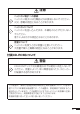 安全上のご注意 保証規定 安全上のご注意 1. 保証期間内に取扱説明書に従った正常な使用状態で故障した場合には、無料修 理いたします。 このたびは本機をお買い上げいただきまして、誠にありがとう ございます。 ご使用になる前に、この「安全上のご注意」をよくお読みの上、 正しくお使いください。 危険 この表示を無視して誤った取り扱いをすると、人 が死亡または重傷を負う危険が差し迫って生じる ことが想定される内容を示しています。 警告 この表示を無視して誤った取り扱いをすると、人 が死亡または重傷を負う危険が想定される内容を 示しています。 注意 この表示を無視して誤った取り扱いをすると、人 が傷害を負う危険が想定される内容および物的損 害のみの発生が想定される内容を示しています。 絵表示の例 記号は「してはいけないこと」を意味しています(左の例 は分解禁止)。 ●記号は「しなければならないこと」を意味しています。 危険 2.
