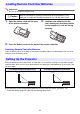 Loading Remote Controller Batteries Important! Be sure to use alkaline batteries only. *Caution RISK OF EXPLOSION IF BATTERY IS REPLACED BY AN INCORRECT TYPE. DISPOSE OF USED BATTERIES ACCORDING TO THE INSTRUCTIONS. 1. Open the battery cover on the back of the remote controller. 2. 3. Close the battery cover on the back of the remote controller. Load two new batteries into the case, making sure that their positive (+) and negative (–) ends are facing correctly.