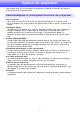 Sommaire A propos de ce manuel... .................................................................................. 5 Aperçu du projecteur...................................................... 6 Caractéristiques et principales fonctions du projecteur..................................... 6 Touches du projecteur et touches de la télécommande ................................... 7 Fonctionnalités pendant la projection .......................... 8 Manipulation de l’image ......................................