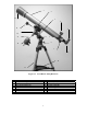 1 2 16 3 4 15 5 14 13 8 9 12 7 6 10 11 Figure 1-1 AstroMaster 90 EQ Refractor 1. 2. 3. 4. 5. 6. 7. 8. Telescope Optical Tube Dovetail Mounting Bracket RA. Setting Circle Star Pointer Finderscope Eyepiece Diagonal Focus Knob R.A. Slow Motion Cable 9. 10. 11. 12. 13. 14. 15. 16. 4 Latitude Adjustment Screw Accessory Tray Tripod Counterweight Bar Counterweights Equatorial Mount Dec.
