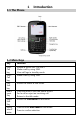 1.1 The Phone 1 Introduction 1.2 Main Keys Key Function SIM1 Call key Answer a call to SIM 1 or SIM 2. Make a call by using SIM1. View call logs in standby mode. SIM2 Call key Left Soft key Make a call by using SIM2. End/P ower Key Press and hold to turn the phone on/off. End a call or reject an incoming call. Return to the idle mode. Right Soft Key Access the Phonebook in idle mode. Navig ationC enter Press to enter Main menu in idle mode. Access the Menu in idle mode.