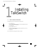 TS-user manual_Final_3rd.qxd 8/9/01 2:14 PM Page 1 1 Installing TalkSwitch 1.1 What's included with TalkSwitch The TalkSwitch products come shipped with the following items. 1. The TalkSwitch Unit 2. AC Power Adapter (Warning: never use any other Power Adapter other than the one provided with the TalkSwitch.) 3. 9 pin Serial Cable 4. 6' RJ-11 Telephone Cable - ( 2 ) 5. Software CD (This contains the configuration software that you can use to setup and configure TalkSwitch) 6.