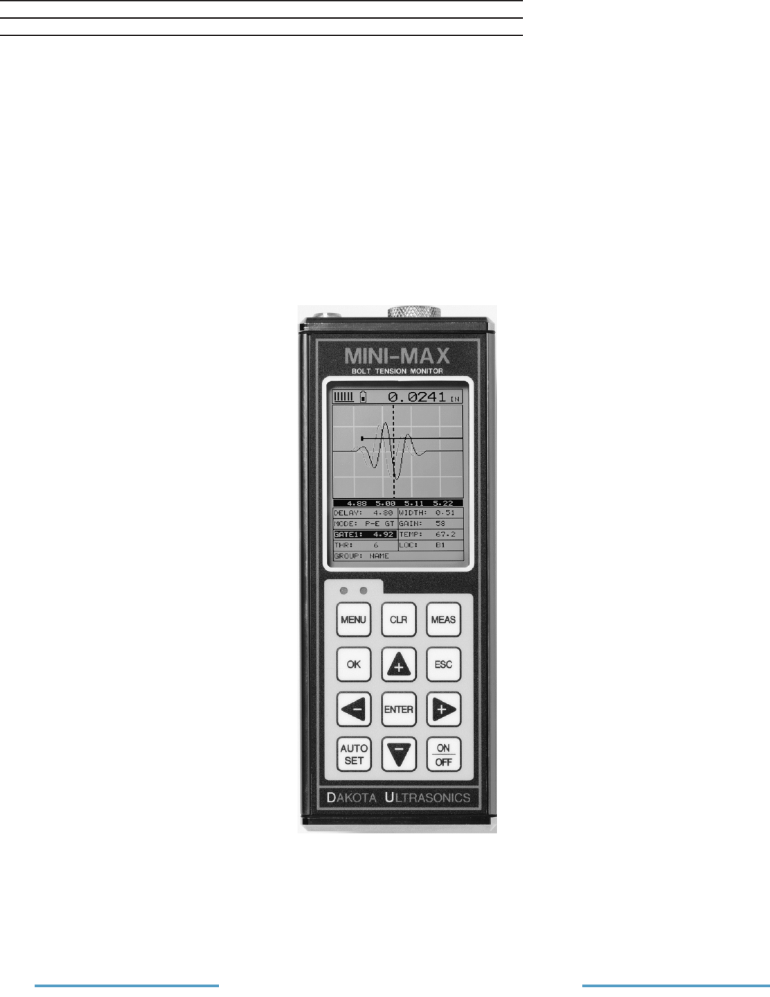 MINI-MAX Ultrasonic Bolt Tension Monitor 5.2 Features of the M INI-MAX The Dakota Ultrasonics MINI-MAX, Ultrasonic Bolt Tension Monitor, defines the State of the Art in the measurement of the actual clamp load produced by tightening a fastener. The MINI-MAX can measure time, elongation, load, stress, or %strain in bolts of virtually any material from 1 inch to 4 feet in length.