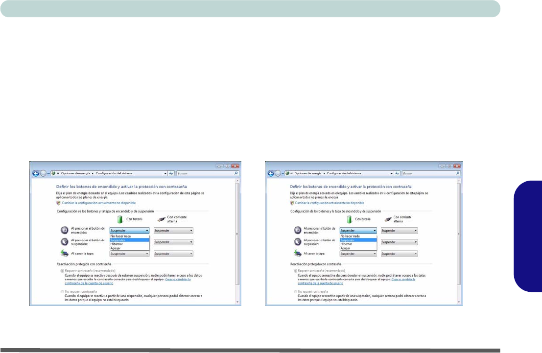 El panel de control de las opciones de energía (menú Hardware y sonido) de Windows (ver la página 145) permite