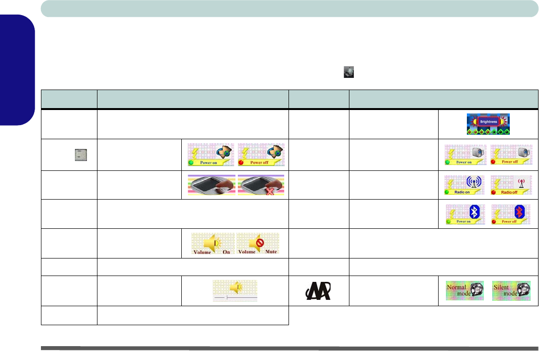 basic function key combinations; visual indicators (see the table below) are available when the hot key utility is in-