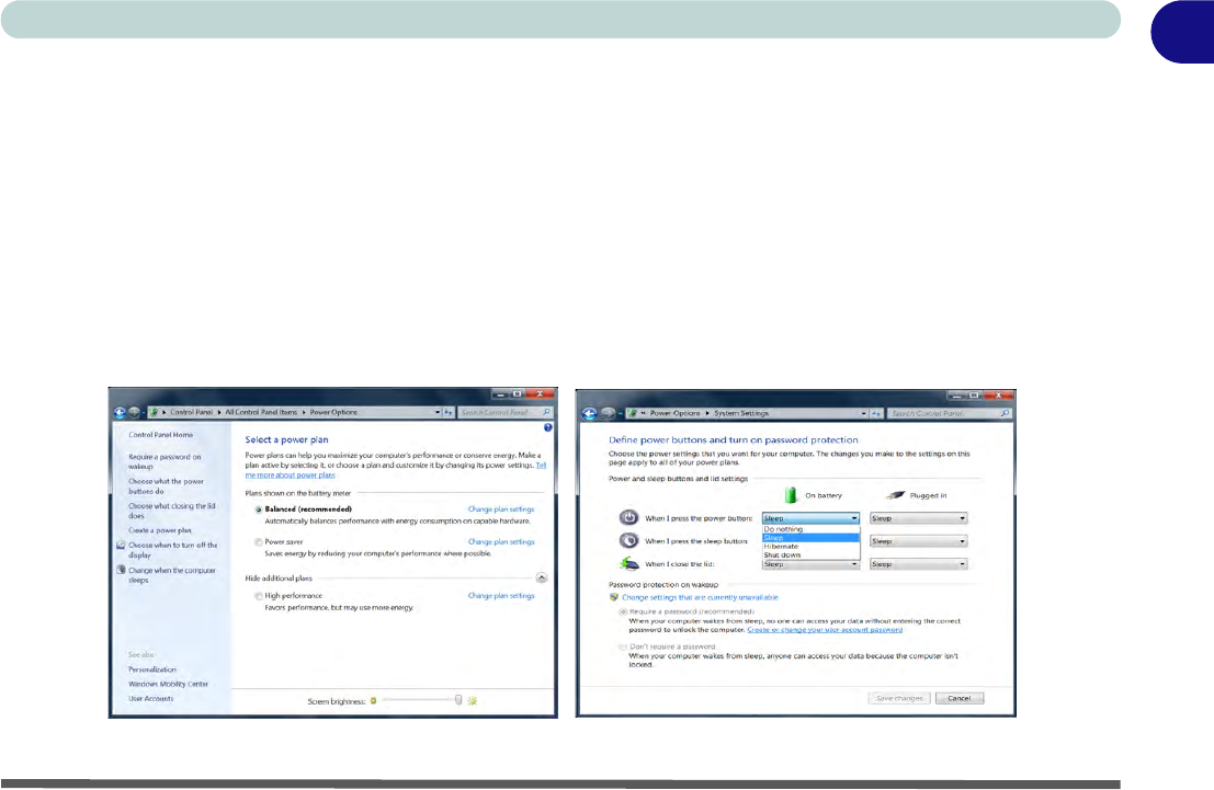 The Power Options (Hardware and Sound menu) control panel icon in Windows (see page 1 - 23) allows you