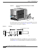 Chapter 3 Installing the Router Connecting to an AC Power Source Figure 3-18 AC Power Distribution Unit 1 4 3 5 57650 6 2 1 Captive screws (four) 4 AC power distribution unit 2 AC power cord receptacle A 5 Guide pin 3 AC power cord receptacle B 6 Blower module connector To connect AC power to the AC PDU on the router, see Figure 3-18 and follow these steps: Step 1 Attach an ESD-preventive strap to your wrist and connect the leash to the chassis or to another grounded, bare metal surf