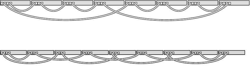 In this example, nine switches are stacked side-by-side with redundant connections by using 0.5- and