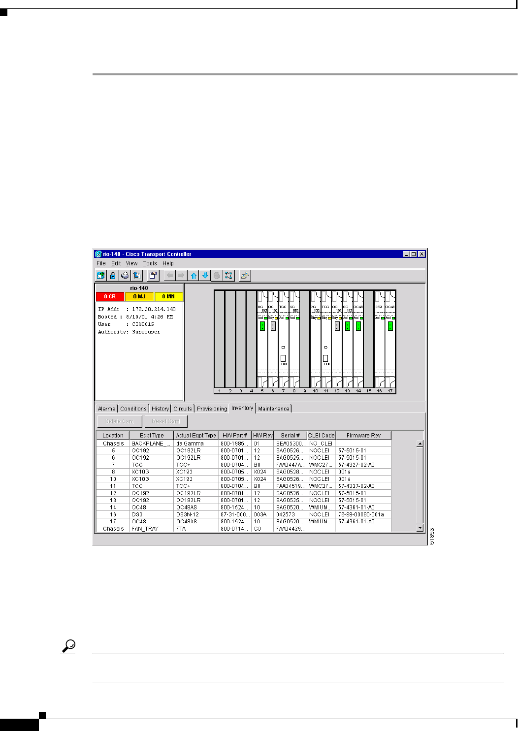 The Inventory tab (Figure 3-10) displays information about cards installed in the ONS 15454 node