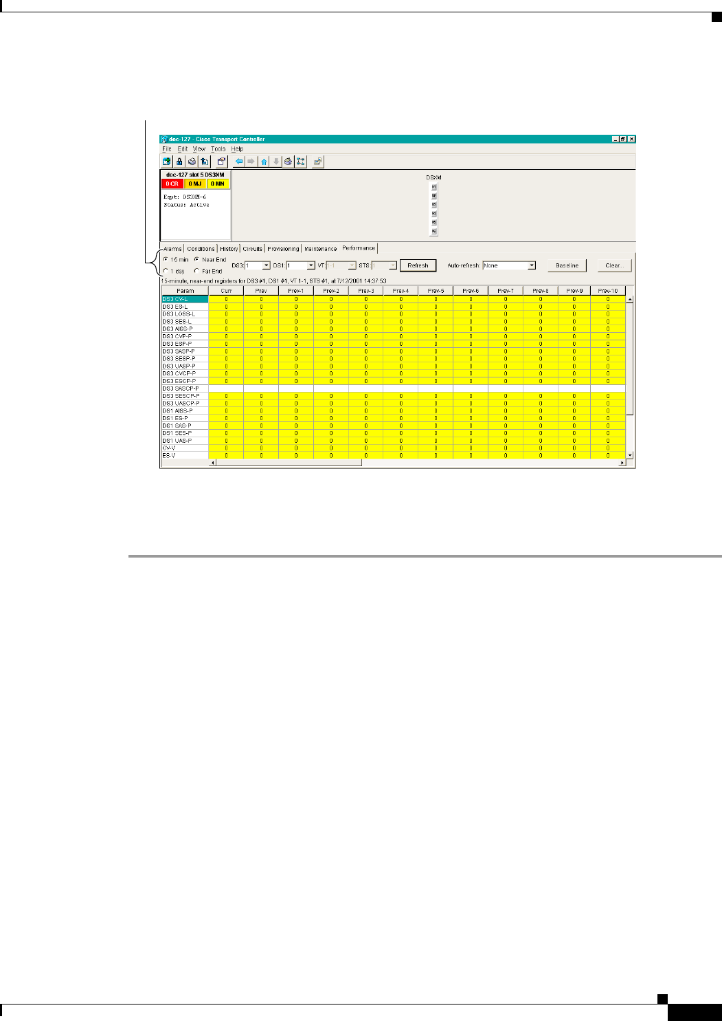 Step 4 Click the Refresh button. Performance monitoring parameters display in 15-minute intervals
