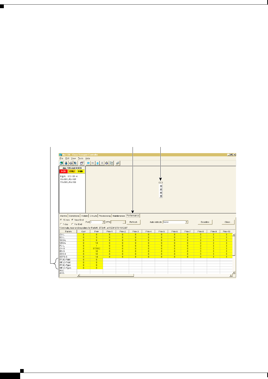 section on page 8-14, the “OC-3 Card Performance Monitoring Parameters” section on page 8-33, or the