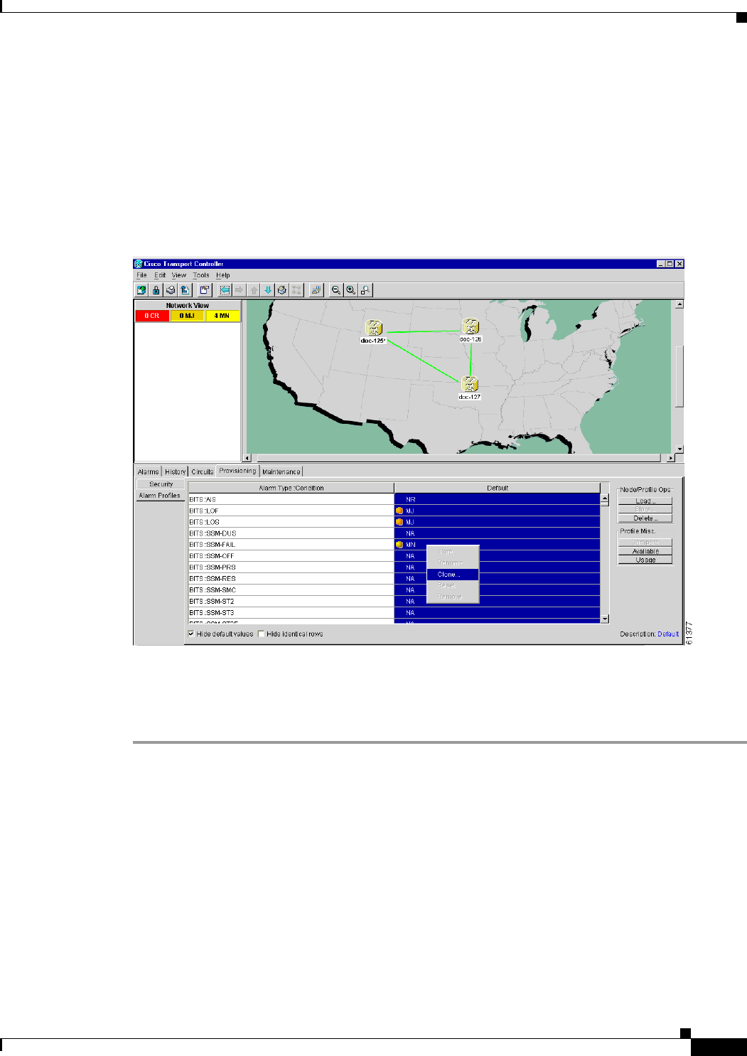 (Figure 10-7.) A default alarm profile (in the Default column) is pre-provisioned for every alarm. After