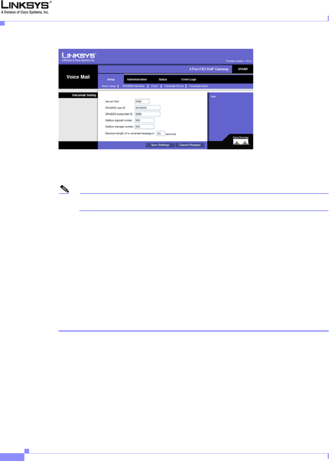 Figure 3-17 SPA400 Administration Web Server—Setup/Voicemail Server Page