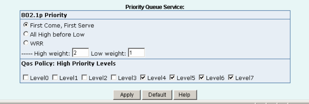 Qos Policy: High Priority Levels: 0~7 priority level can map to high or low queue.